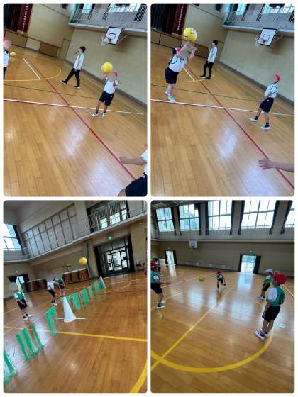 5月の体育は、プレルボールをしています。プレルボールは、ドイツで考案されたハンドテニスの一種で、高さ約40メートルのロープを挟んで、ボールをバウンドさせて打ち合うネット型ゲームです。今回のプレルボールでの目標は、プレルボールのやり方を知り、パスを続けたり、玉を返したりしてゲームをし、規則を工夫したり、作戦を選んだりし、友だちのよい動きを見つけて、伝えることです。友だちと協力してゲームをしていますよ!