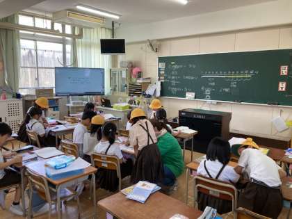 授業中も、問題の考え方が分かった人が黄色帽子をかぶって「黄帽先生」になり、友だちのところに教えに行っています。
