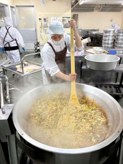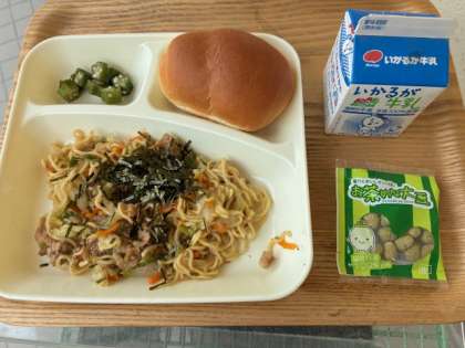 今日の献立の和風焼きそばは、豚肉、キャベツ、たまねぎ、ピーマン、にんじんが入った焼きそばです。うすくちしょうゆ、こいくちしょうゆ、塩、こしょうであっさりとした味で、とてもいい仕上がりでした。