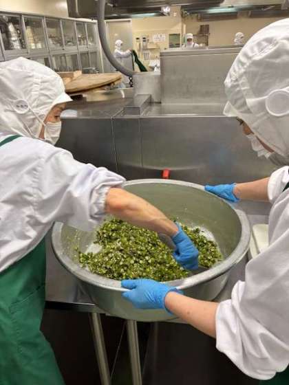 オクラのかつお梅風味は、オクラを焼物機で蒸し、かつおぶし、梅肉、砂糖、米酢、うすくちしょうゆを合わせたタレをかけて、あえています。