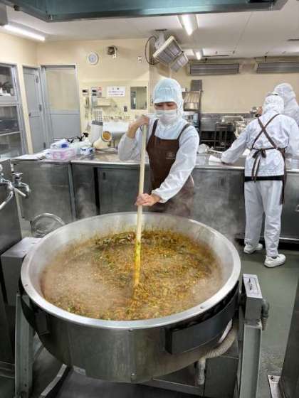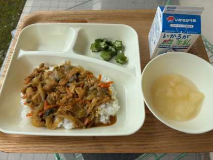 今日の献立の和風カレー丼は、豚肉、うすあげ、たまねぎ、にんじん、青ねぎ、しょうがが入っています。けずりぶしでだしをとり、カレー粉と米粉のカレールウの素、塩で味付けをしています。ごはんがすすむ一品でした。