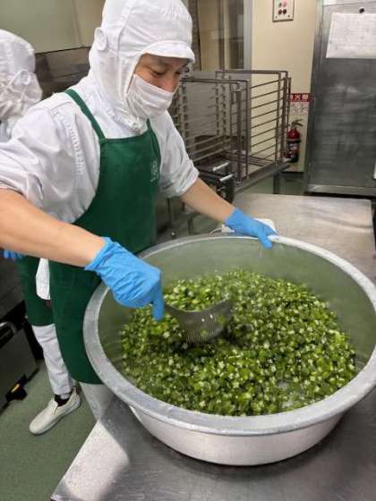 オクラの甘酢あえは、焼物機で蒸したオクラに、砂糖、塩、米酢、うすくちしょうゆを合わせて煮たタレをかけて、あえています。