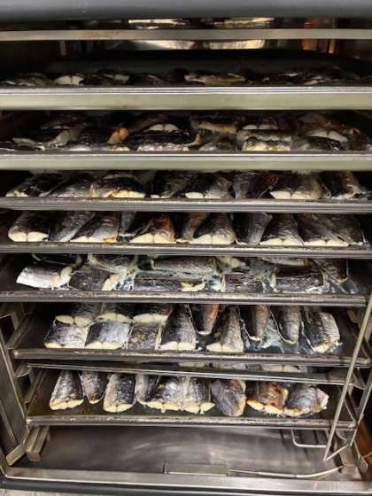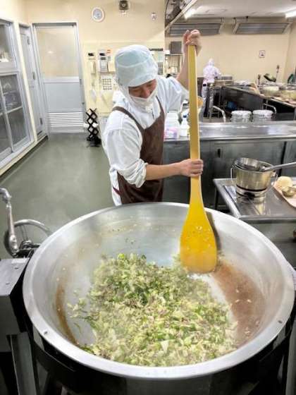 今日の献立のさごしのおろしじょうゆかけは、料理酒で下味をつけたさごしを焼物機で焼き、だいこんおろし、みりん、うすくちしょうゆを煮立てたタレをかけています。さっぱりと焼き上がったさごしに、だいこんおろしのタレがとてもよく合っていました。