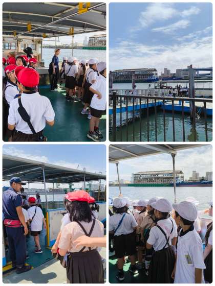 現在3年生は、総合的な学習の時間の学習で南津守について学習をし、調べています。その時に、南津守に「めがねばし」があるから調べたいということが出てきましたので、木津川を通るわたしぶねに乗らせていただくことになりました。そのため、今日は2・3時間目に行ってきました。初めて乗ったこと子どもたちが多く、子どもたちの振り返りでは、「千本松渡船は自転車が乗れるのを初めて知った」や「船にはいすがないの?」、「むりょうでのれるの?」などが出てきました。体験をさせてもらうよい経験になったと思います!♪