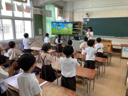 今日は、1年生が外国語活動を行なっていました。「幸せなら手をたたこう」を英語で歌います。みんな元気よく活動していました!