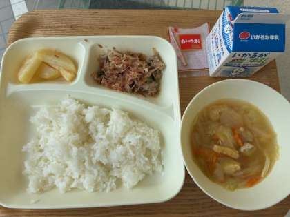 今日の献立のゴーヤチャンプルーは、沖縄の郷土料理です。豚肉、もやし、ゴーヤ(にがうり)を炒め、塩とこいくちしょうゆで味付けをしています。食べる時に、1人1袋のかつおぶしをかけます。食べる時にかつおぶしをかけることで、より風味と旨みを味わうことができます。