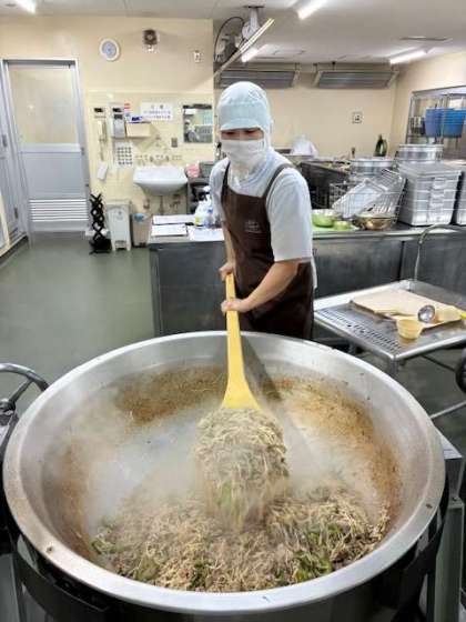 五目汁は、鶏肉、うすあげ、キャベツ、たまねぎ、にんじんが入った汁ものです。だしこんぶとけずりぶしでとっただしと、素材の旨みが重なり合い、とてもいい味に仕上がっていました。