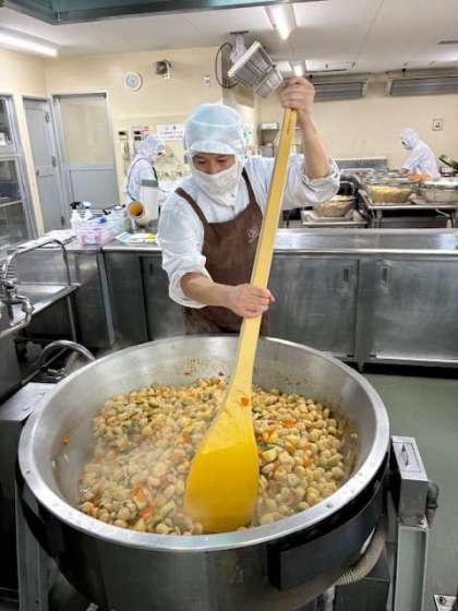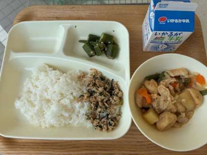 今日の献立の鶏肉と一口がんもの煮ものは、鶏肉、じゃがいも、一口がんも、たまねぎ、にんじん、さんどまめが入った煮ものです。とてもボリュームがあり、けずりぶしでとっただしと素材の味が合わさって、とてもおいしい一品でした。