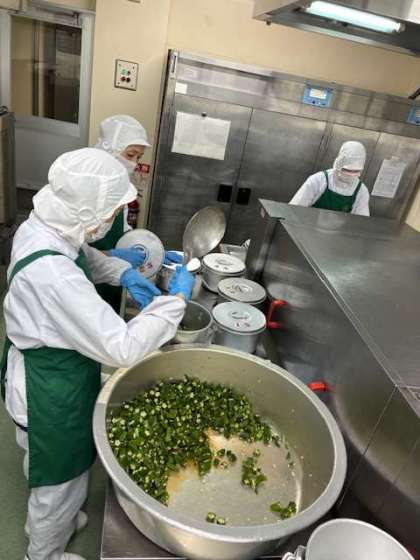オクラの梅風味は、焼物機で蒸したオクラに、梅肉、砂糖、米酢、うすくちしょうゆで作ったタレをかけて、和えています。梅の風味が暑気払いにうってつけの一品でした。
