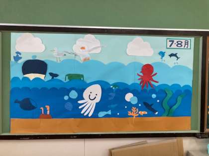 さわらび教室に、夏らしい掲示物がありました。それぞれ、海の生き物をつくったそうです。