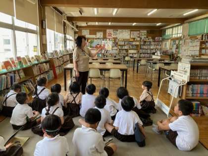 1年生は、着衣泳で疲れたあとですが、図書の読み聞かせを楽しんでいました。