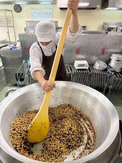 ささみとキャベツのごまみそ焼きは、新献立になります。ささみとキャベツをねりごま、砂糖、うすくちしょうゆ、白みそと混ぜ合わせていりごまをふり、焼物機で焼いています。ごまの風味が感じられる、こちらも素晴らしい一品でした。
