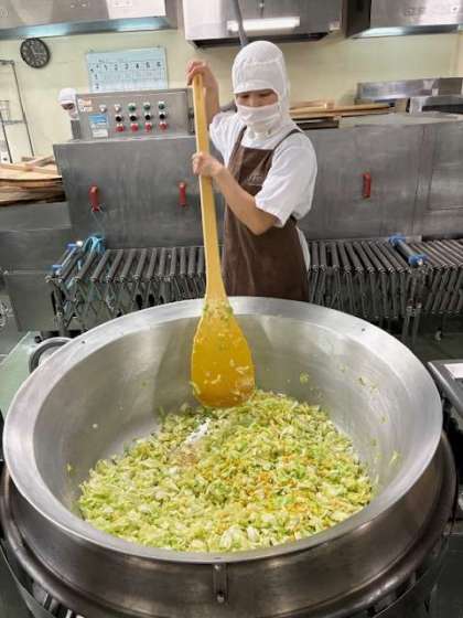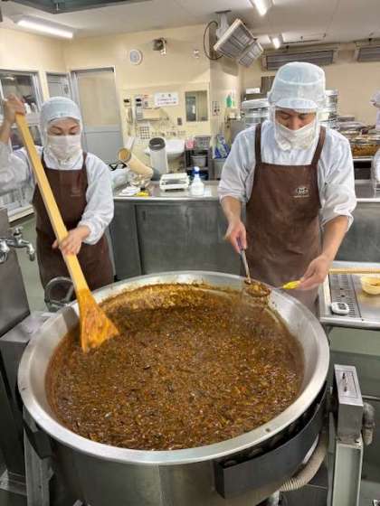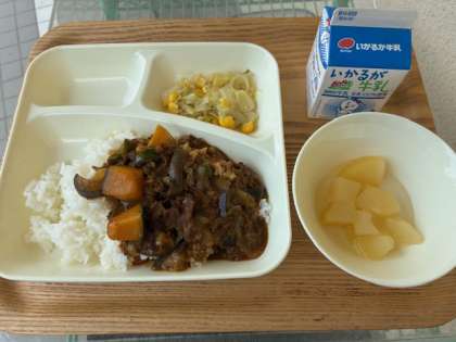 今日の献立の夏野菜のカレーライスは、夏野菜のかぼちゃ、ナス、ピーマン、そして牛肉、たまねぎ、トマト缶、セロリ、にんにくが入った具沢山のカレーです。水分を多く含むなすがたくさん入っていたので、とてもまろやかな仕上がりになっていました。