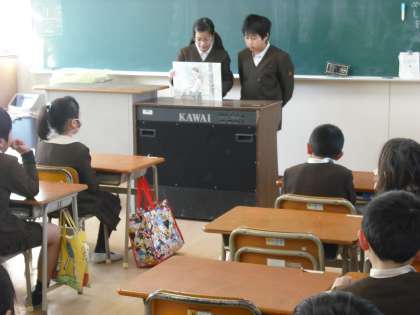 2月17日(水)の朝の時間に、図書委員会の児童が、1・2年生に読み聞かせを行いました。昨年度から始まった取り組みで、学期に2〜3回程度読み聞かせをしています。どの本を読んであげようか、どの話を喜んでくれるかなと、1・2年生の顔を思い浮かべながら絵本や紙芝居を選ぶ図書委員。委員会活動の時間や休み時間なども使って練習していました。1・2年生も、図書委員会の読み聞かせを楽しみにしています。