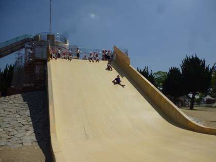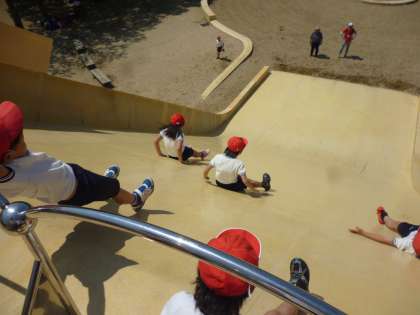 大泉緑地では、見たことがないような大きなすべり台を見て、子どもたちは大喜びでした。はじめはおそるおそる上まで上がった子どもたちもすべり降りると「こわいけど楽しいー!!」と歓声を上げていました。