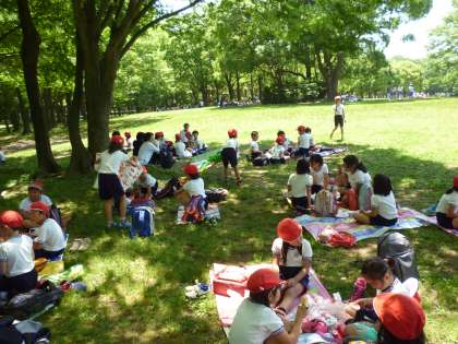 広い緑の芝生の上で楽しくお弁当を食べた後、おにごっこをして遊びました。