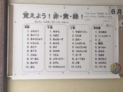 よくかんで食べることの大切さやおやつの食べ過ぎへの注意、赤・青・緑の栄養素による食品分け等の掲示をしています。