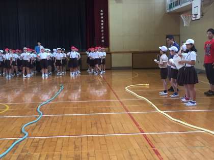 雨で運動場が使えないため、体育館で綱引きを楽しみました。