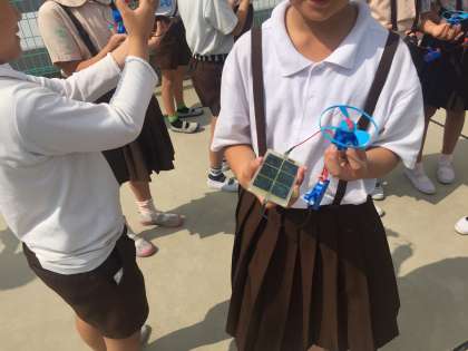 光電池は光量で電力が大きく変わります。光電池を傾けたり、向きを変えたりしながら、プロペラが一番よく回るところを真剣に探していました。
