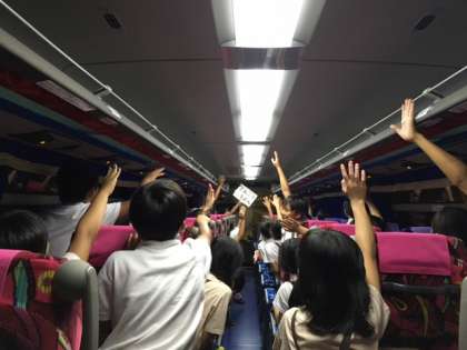 宿舎まであと少し、バスレクの子たちが頑張って盛り上げます!
