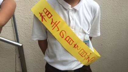 朝から大変蒸し暑い日でしたが、子ども達の大きなあいさつの声で気持ちのよい朝となりました。児童会の子ども達は、たすきに書いた自分めあてに向かって頑張っています。