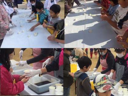 本日、南津守小学校の校庭で、もちつき大会が行われました。つきあがったもちは、子どもたち自身が丸め、きな粉や醤油をつけていただいたり、あんこを入れていただいたりしました。子どもたちは、笑顔いっぱいで、おいしくいただきました。また、おもちをつく体験もさせていただきました。全員に紅白のおもちのお土産もいただき、子ども達にとってうれしい1日になりました。