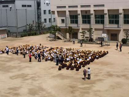 給食室より出火、延焼の恐れがあるため、全児童は運動場へ避難する。