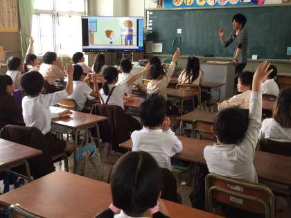 各教室の大型液晶テレビには、英語で紹介されたアニメーションや、ABCの歌のアルファベットが映し出され、どの学年の児童たちも楽しそうに声に出して活動していました。