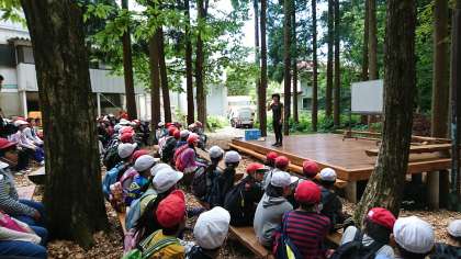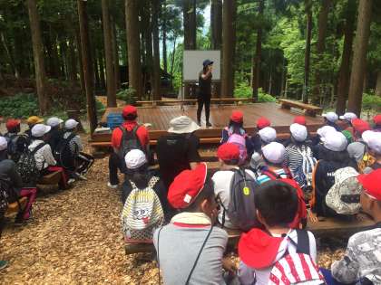 森に囲まれたステージで、スタッフの方から飯ごう炊さんとカレー作りの説明をしていただいています。
