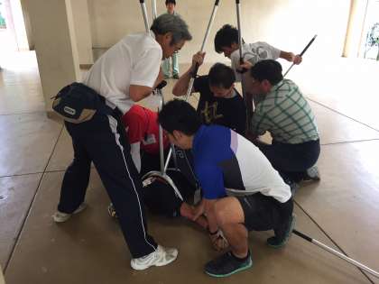 日常的によくある来校者とのインターホン対応から始まり、やがて不審者は刃物を出して暴れだすという想定です。警察への通報・教室の施錠・子どもたちへの指示・万が一の救護の準備など、子どもたちの安全を確保するための教職員緊急体制で訓練に挑みました。子どもたちは教室の中央に集まり、物音を立てずに静かに身を潜めるという訓練に取り組みました。皆、真剣な表情でした。