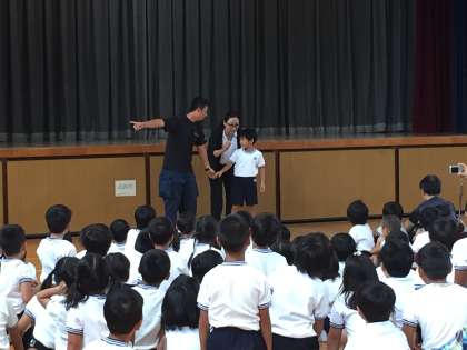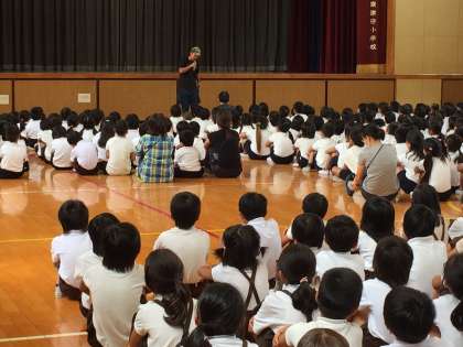 訓練の後、子どもたちは講堂に移動し、西成警察署の防犯係の方からのお話を聞きました。子どもをねらったよくある犯罪手口や、日常の生活の中で気を付けること、不審な人に声をかけられた時の対応など、たくさんのことを学ぶことができました。