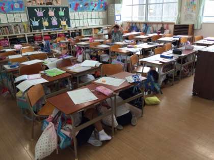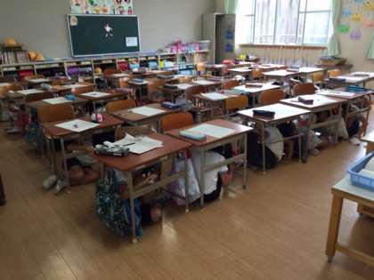 地震の強い揺れ(想定)に備えて、各教室では机の下に潜るなどの訓練を行いました。