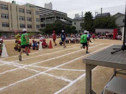 たくさんの玉がカゴに入るように、1年生が一生懸命紅白玉を投げました。途中ダンスが入りました。