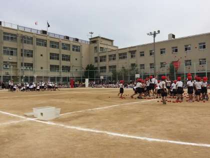 児童の競技は全校での「大玉送り」から始まりました。1〜6年生が力を合わせて競技に取り組みました。