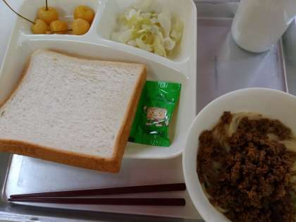 昨日の給食は、タンタンめん、キャベツの甘酢づけ、さくらんぼの缶詰、食パン、マーガリン、牛乳でした。