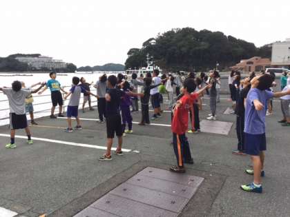 大きな声で挨拶をして、ラジオ体操で体を起こします。