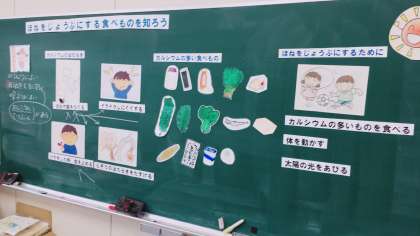 3年生は「ほねを丈夫にする食べ物」です。牛乳が、毎日給食に出る理由を考え、カルシウムの働きやカルシウムを多く含む食べ物をビンゴを交えて覚え、楽しく学習しました。