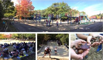 11月初旬の錦織公園は木々の紅葉がはじまり、自然の色彩の美しさからも『秋』が感じられます。クヌギの木の下には無数のどんぐりが地面に落ちていて、袋いっぱいに拾い集めている児童もいました。(一番たくさん集めていたのは鬼塚先生でした。その量約3kg…!何かに使用するようです。)