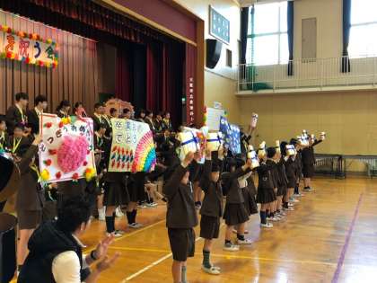 次は、各学年が用意したプレゼントを6年生に渡し、6年生からもプレゼントを受け取りました。各学年のプレゼントはどれも力作です。