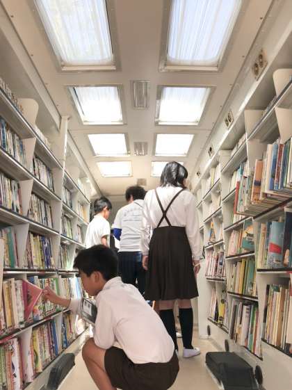 自動車文庫のバスの屋根は部分的にガラスになっています。そこから日光が差し込み、車内はいつもより明るく感じます。