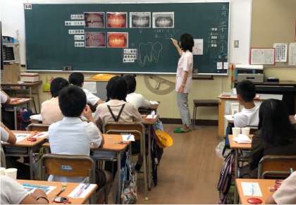 南津守小学校では、2年生の「歯磨き指導」、4年生の「フッ化物塗布」に引き続き、6年生では生活習慣病予防の内容を含めた歯科保健指導を行っています。これらは、自分の健康を自分で管理できる力や実践力を育むことをねらいとしています。
