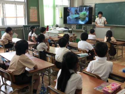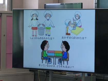 今日は「きゅうしょくしつのやくそく」ということで、給食室や給食室での調理について学習しました。