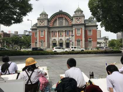 中央公会堂での写生会では、大阪の歴史ロマンを感じながら芸術的活動に取り組みました。柱一つ一つ、レンガ一つ一つに注目しながら丁寧に描く子ども達からは、「綺麗な建物やな。」「大きいなあ。」などの声が聞かれ、珍しい建物に興味津々の様子でした。道行く人達にも声をかけられ、絵を褒めてもらっている子もいましたよ。