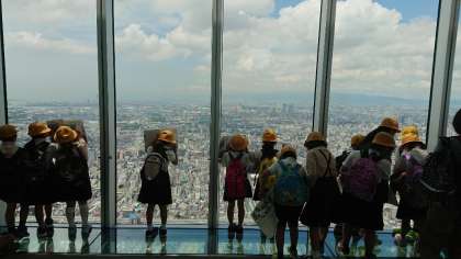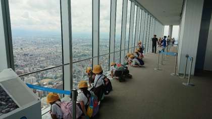 あべのハルカスでは地上60階、300メートルの高さまでエレベーターであっという間に着きました。天気もよく、展望台からは遠くの山まで見渡すことができました。300メートルの高さから見る景色に子どもたちは興奮気味に「通天閣が見えた!」「大阪城あった!」「ヘリポート!」「車がおもちゃみたい!」とガラス越しに声をあげていました。