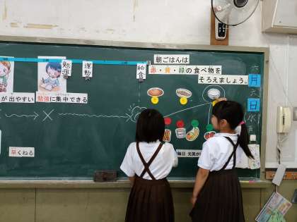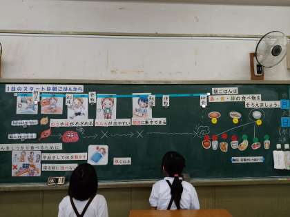 3年生の3クラスで、栄養指導「1日のスタートは朝ごはんから」を行いました。朝ごはんを食べることで、「脳や体が目覚める」「うんちが出やすくなる」「勉強に集中できる」などの良いことがあります。午前中のエネルギー源になるため、朝ごはんが食べられない時にも、代わりになるものを食べてくることが大切です。これからプール学習がはじまりますので、必ず朝ごはんを食べてきてほしいと思います。ご家庭でも「早ね、早起き、朝ごはん!」を合言葉に、規則正しい生活ができるよう、お声掛けをお願いします。3年生保護者の皆様からは「朝、進んで早起きをしていました。毎日のこさずしっかり食べていました」「自分から起きだして、毎日食べていました」「学習の内容を家でお話ししてくれました」などの感想がありました。ご協力あリがとうございます。