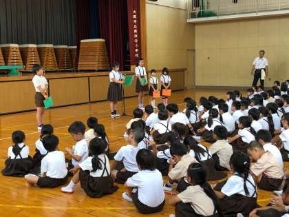 2年生と5年生の代表児童による作文発表では、1学期の学習で学んだことがたくさん紹介されました。2年生では、学校探検で1年生を案内したことや、ミニトマトの世話をして育てたこと…。5年生では、「走る」ことを通して見つけた自分の成長、委員会活動を頑張っていること、校外学習での思い出など…、たくさんの『学び』を立派に発表することができました。