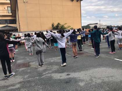 大きな声で挨拶をして、ラジオ体操で体を起こします。