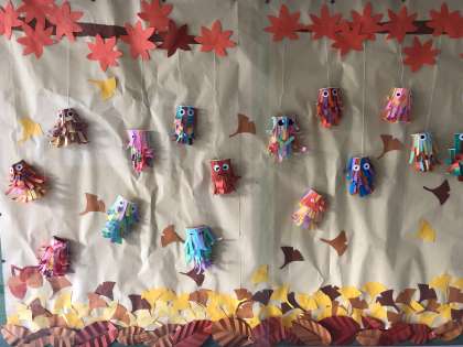 玄関掲示が11月になり、新しいものに変わりました。ミノムシの掲示物です。みなさん、ミノムシってどんな虫か知っていますか?実は、オオミノガという虫の幼虫なんです。ミノムシは口から糸を吐き、木の枝や葉を巻いて巣をつくります。そして巣のまま木にぶら下がって冬を越していくという、まさに「秋」を代表する生き物なのです。玄関の掲示物は、掲示委員会の人たちが作ってくれました。素敵な掲示物をありがとうございます。