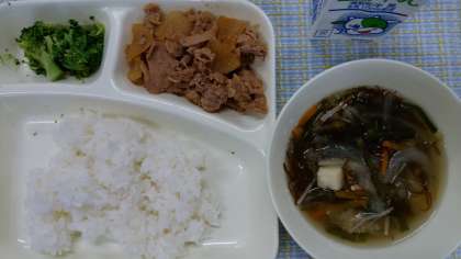 11月8日(木)の献立は、学校給食献立コンクールの最優秀賞作品で、「豚肉のコチジャンいため、もずくスープ、ブロッコリーのナムル風あえもの、ごはん、牛乳」です。