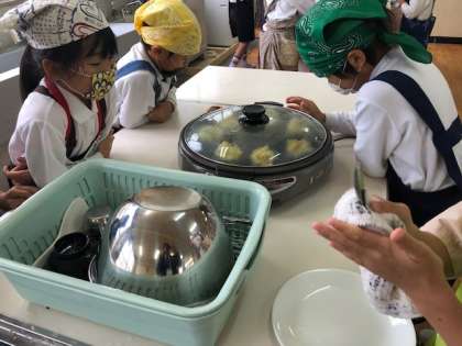 今日は2年生が家庭科室でおいもパーティーを行いました。学習園で育てたさつまいもを使って、おいものカップケーキを作りました。どのグループも大変上手にでき、みんなで美味しくいただきました。